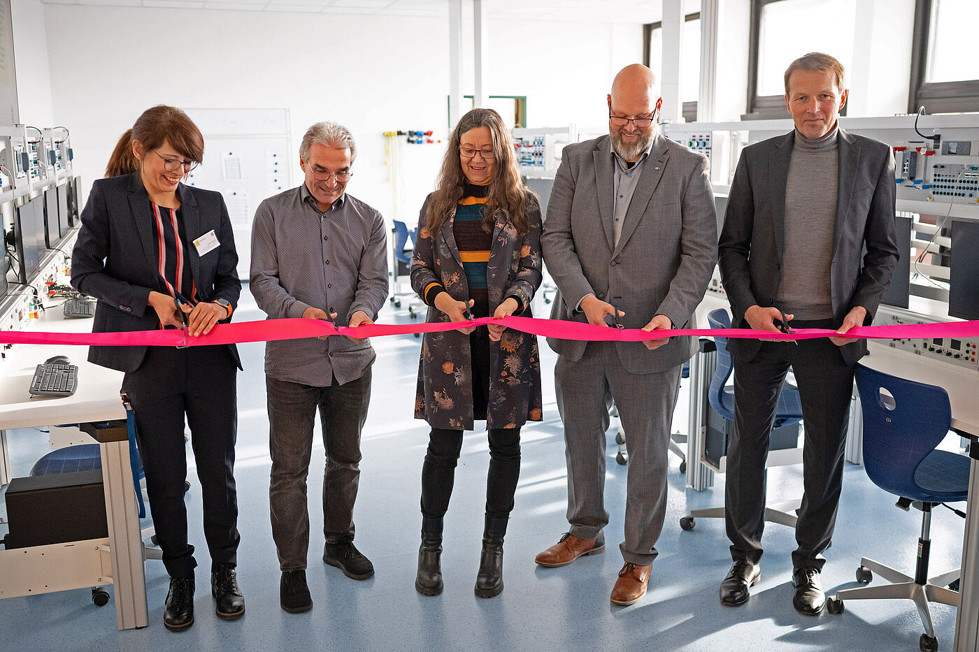 Nach dem symbolischen Durchschneiden des Eröffnungsbands stellten die Lehrkräfte dann die neuen Labore vor. Räume, die von ihnen über zwei Jahre hinweg mit viel Fachwissen, Sorgfalt und Engagement geplant worden sind. Sie werden so den Anforderungen der digitalen Transformation gerecht. Zentral, um den aktuellen Strukturwandel erfolgreich zu gestalten.