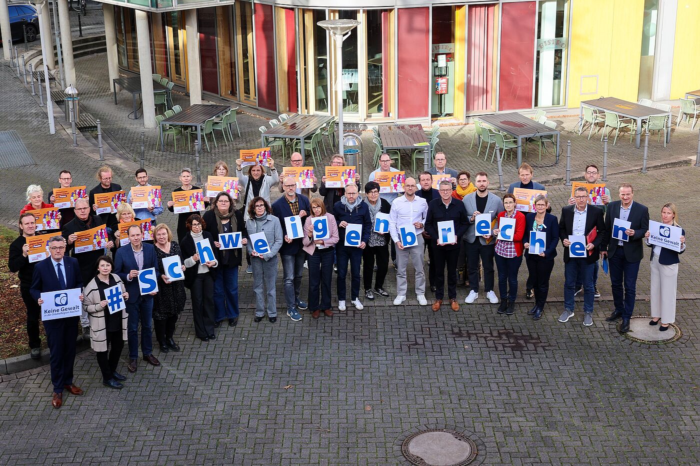 StädteRegion Aachen. Der 25. November ist der „Internationale Tag zur Beseitigung von Gewalt gegen Frauen“. Hierbei handelt es sich um einen Gedenk- und Aktionstag zur Bekämpfung von Diskriminierung und jeder Form von Gewalt gegenüber Frauen und Mädchen. „Ziel dieses Tages ist es, für das wichtige Thema Aufmerksamkeit und Bewusstsein zu schaffen und Solidarität zu zeigen,“ so die Gleichstellungsbeauftragte der StädteRegion, Kerstin Kosanke. Auch Städteregionsrat Dr. Tim Grüttemeier betont: „Die gesamte Verwaltung der StädteRegion möchte sich solidarisch zeigen und auf das Thema aufmerksam machen, um „das Schweigen zu brechen“. Daher haben sich die Verwaltungsspitze, die Dezernatsleitungen, die Amtsleitungen und die Interessensvertretungen an der Mitmachaktion „Wir brechen das Schweigen“ des Hilfetelefons „Gewalt gegen Frauen“ beteiligt. Mit einem Gruppenfoto sind sie alle einhellig dem diesjährigen Appell der Aktion gefolgt, denn dieser lautet: „Gemeinsam gegen Gewalt an Frauen“. Die Verwaltung möchte mit dem entstandenen Bild symbolisch ein sichtbares, gemeinsames Zeichen gegen Gewalt an Frauen setzen und gleichzeitig das Angebot des Hilfetelefons noch bekannter machen.