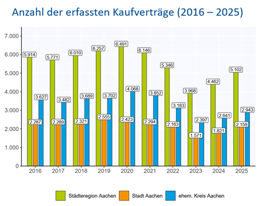 Der Gutachterausschuss erhält als unabhängiges Kollegialgremium sämtliche Verträge über in der StädteRegion Aachen verkaufte Immobilien. Seine Auswertungen tragen wesentlich zur Transparenz auf dem Grundstücksmarkt bei. Die Ergebnisse werden jährlich im Grundstücksmarktbericht veröffentlicht. Er ist über www.boris.nrw.de und im Geoportal der StädteRegion kostenlos abrufbar. Neben dem Grundstücksmarktbericht hat der Gutachterausschuss Immobilienrichtwerte zum Stichtag 01.01.2026 für die Teilmärkte der Ein- und Zweifamilienhäuser und Wohnungseigentum veröffentlicht, die ebenfalls kostenlos abrufbar sind.