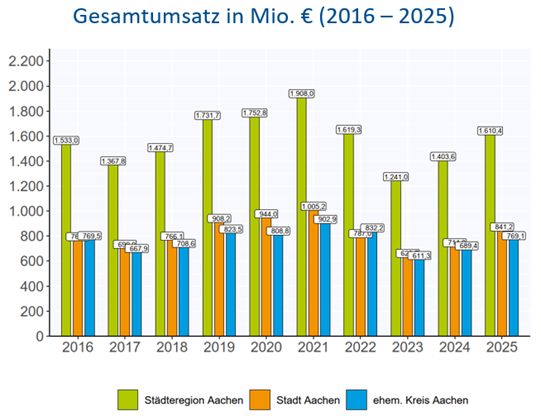 Ebenfalls steigend ist der Gesamtumsatz in der StädteRegion Aachen. Für 2025 sind Immobilienverkäufe im Wert von rund 1,61 Milliarden Euro erfasst worden. Im Jahr 2024 lag der Gesamtumsatz noch bei 1,40 Milliarden Euro. Dieses entspricht einer Umsatzsteigerung von 15 Prozent. Der Gesamtumsatz befindet sich nach einer zweijährigen Delle nun wieder auf dem Niveau von 2022.