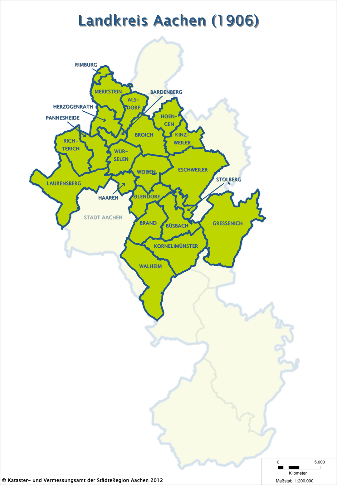 Zum 01.04.1906: Die Landgemeinde Forst wird teilweise in die Stadt Aachen eingemeindet. Die bisher mit Forst verbundene Gemeinde Eilendorf wird selbstständige Bürgermeisterei.