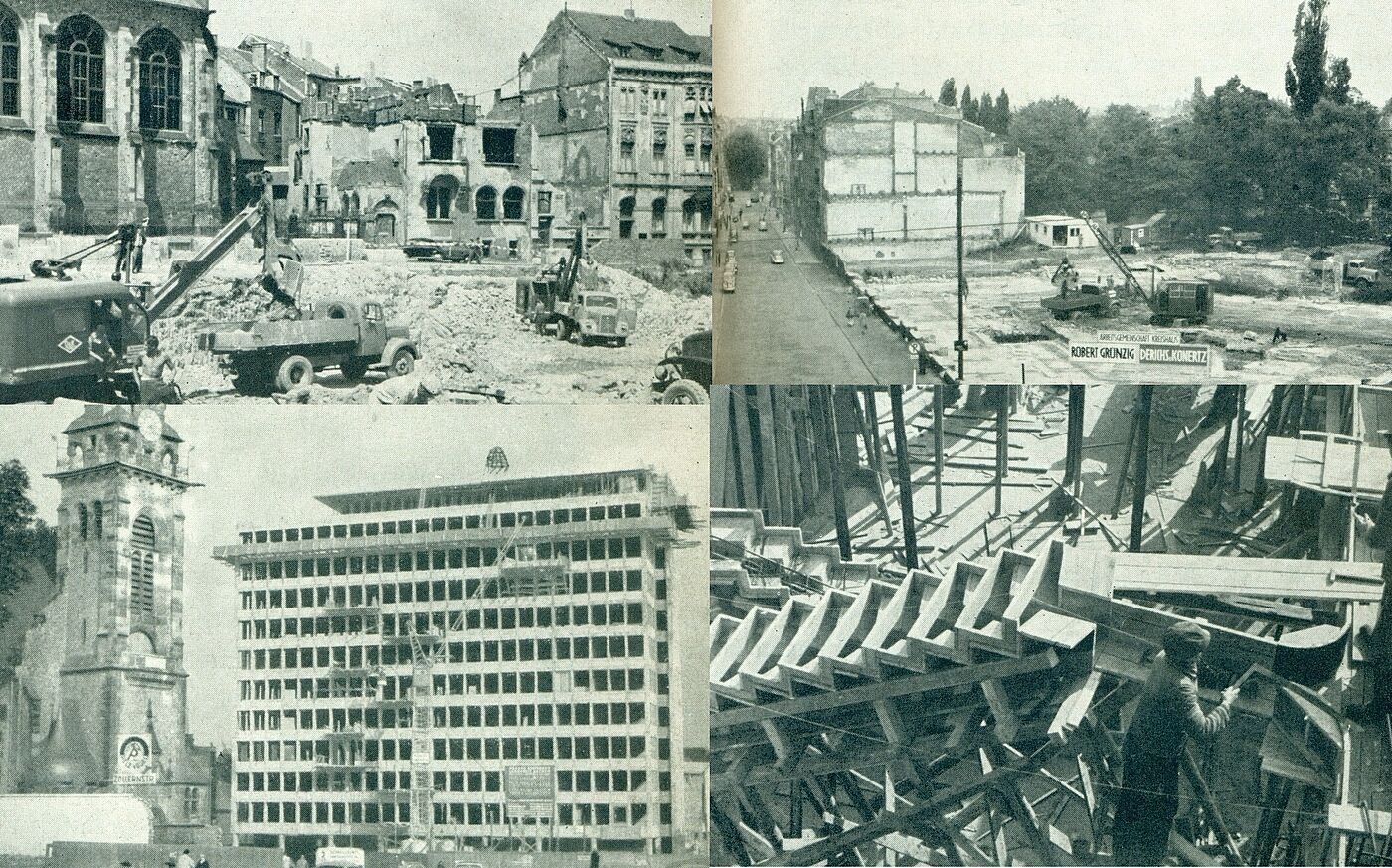 1955 begann der Bau des neuen Kreishauses an historischer Stelle. Zuvor hatte die Kreistagsmehrheit für das Festhalten am Standort Aachen plädiert und ein Angebot der Stadt Stolberg abgelehnt, die ein Grundstück kostenlos zur Verfügung zu stellen wollte. 1953 wurde ein erster Architektenwettbewerb durchgeführt und der Kreistag beschloss am 31. Mai 1954 den Wiederaufbau des Kreishauses an alter Stelle. In einem zweiten Architektenwettbewerb hatte man sich 1954 für den Kölner Architekten und Regierungsbaumeister a. D. Fritz Schaller (1904-2002) entschieden. Im Rahmen einer schlichten Feier wurde dann schließlich am 28. Februar 1956 der Grundstein für das neue Verwaltungsgebäude des Landkreises Aachen gelegt. Die Feierstunde fand im Erdgeschoss des bis zum vierten Stock im Rohbau fertigen Hauses statt. Der Aachener Oberstadtdirektor überbrachte dem Landkreis die Glückwünsche der Stadt und wünschte, „das der Bau zu einem Ausdruck der angenehmen Zusammenarbeit zwischen Stadt und Kreis werde“. Oberkreisdirektor Seulen betonte, dass mit Abschluss des zwölfstöckigen Neubaus auch die räumliche Zersplitterung der Kreisverwaltung auf verschiedene Dienstgebäude behoben werde. Am 5. Dezember 1957 konnten die ersten Büros bezogen werden.