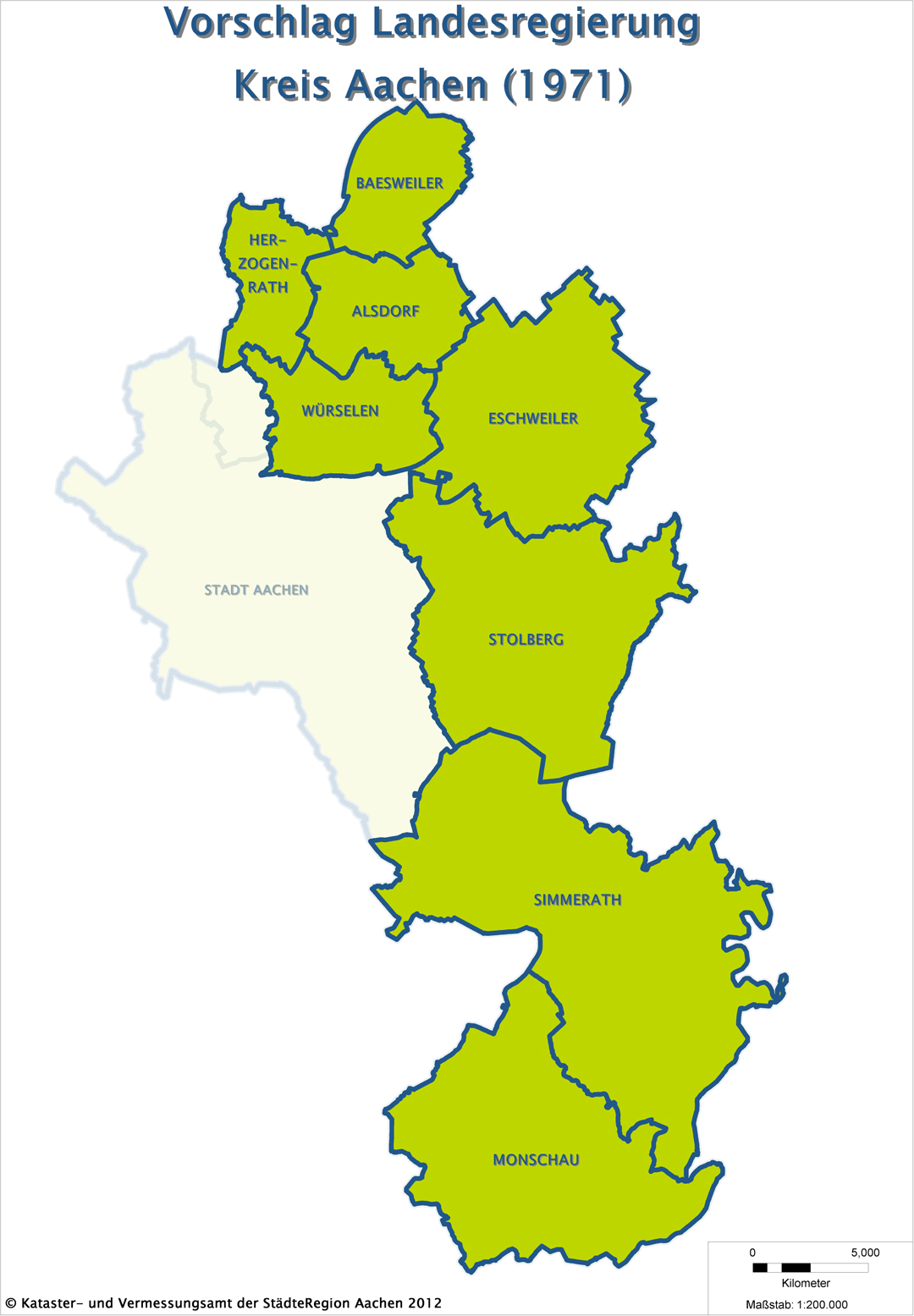 Am 15. Juni 1971 unterbreitet die Landesregierung einen Vorschlag zur kommunalen Neuordnung des Aachener Raumes, der bis auf einige kleinere Änderungen bereits die Gestalt der neuen administrativen Einheiten im Aachener Raum zeigte. Unklarheit herrscht lange über das Schicksal der Gemeinden Walheim, Kornelimüster und Roetgen. Vor Ort bevorzugt man die Bildung einer strukturell homogenen „Münsterlandgemeinde“ und weist die „überzogenen Eingemeindungswünsche“ der Stadt Aachen zurück. Auch das Schicksal der Gemeinde Kohlscheid ist lange nicht geklärt, da sich die Stadt Aachen eine Angliederung wünscht, die Gemeinden Kohlscheid und Merkstein sowie die Stadt Herzogenrath jedoch dafür eintreten, eine neue vergrößerte Stadt Herzogenrath zu bilden.