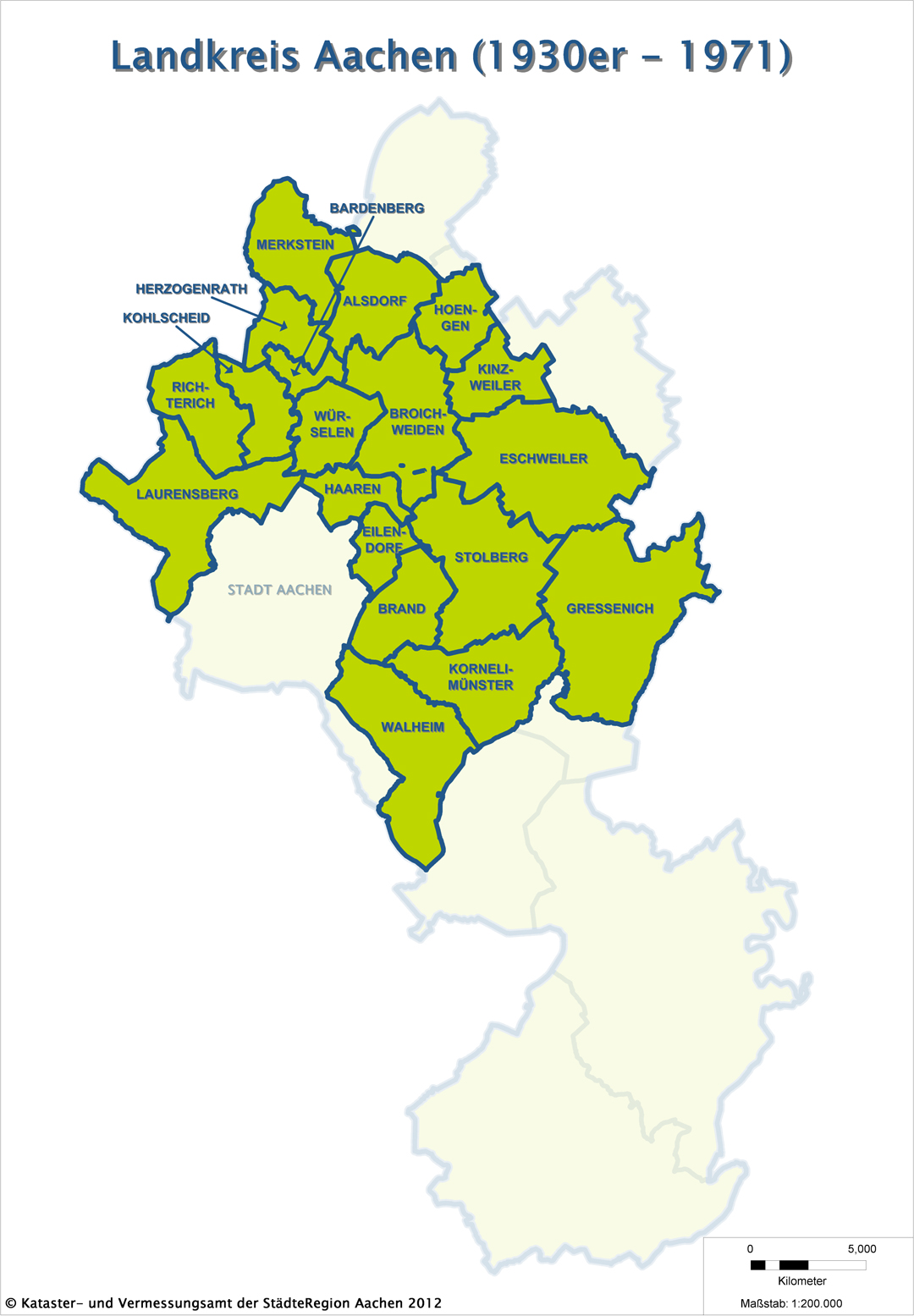 Zum 01.10.1935 wird die Gemeinde Büsbach mit der Stadt Stolberg vereinigt. Auch Teile des Amtes Eilendorf und der Stadt Eschweiler werden der Stadt Stolberg zugeschlagen.