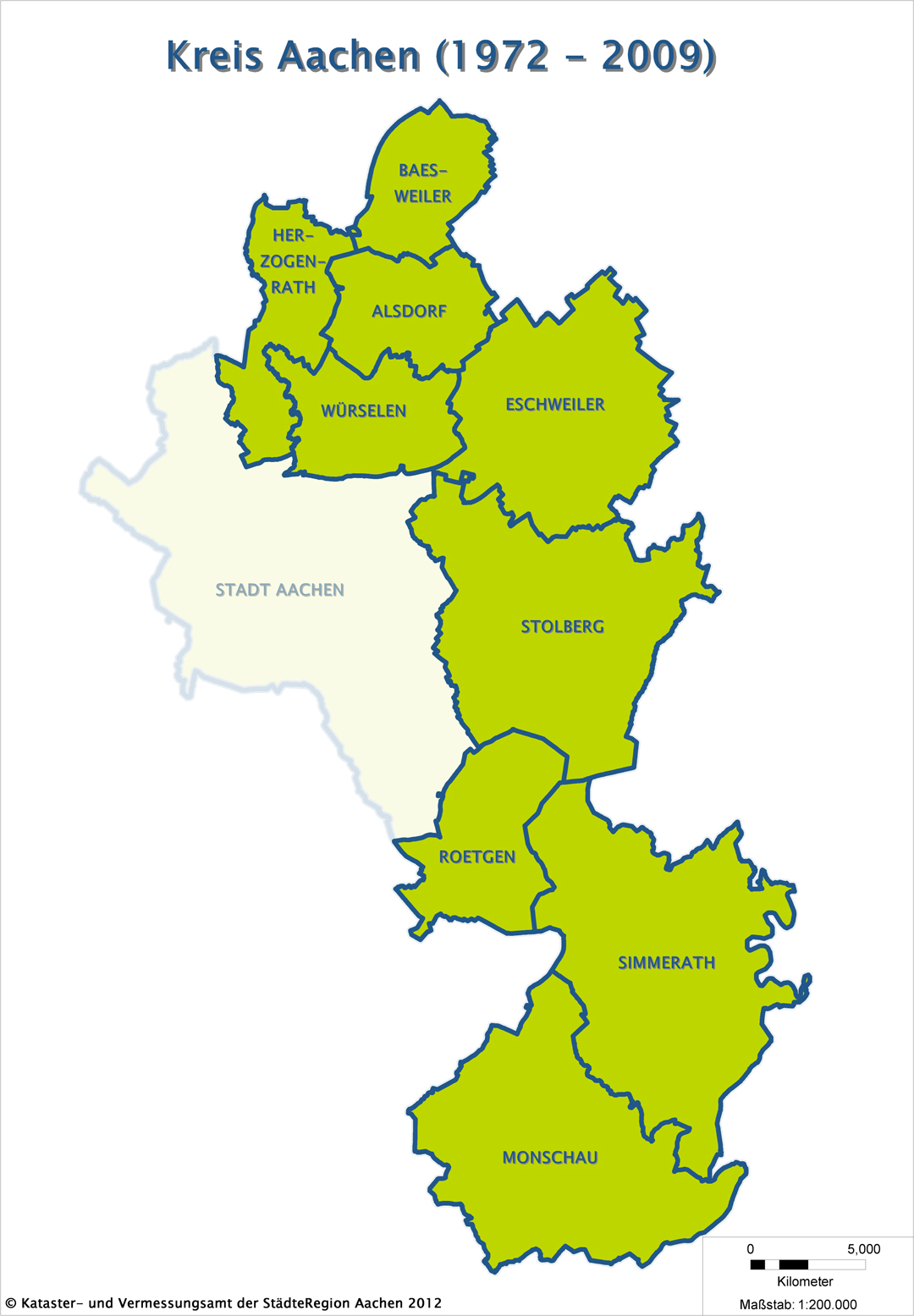 Zum 01. Januar 1972 wird das Gesetz zur kommunalen Neugliederung des Aachener Raumes, das „Aachen Gesetz“ wirksam. Als „Kompensation“ für die abgetretenen ehemaligen Kreisgemeinden wie Eilendorf, Laurensberg, Richterich, Brand, Haaren, Walheim und Kornelimüster wird dem Kreis Aachen nahezu der gesamte Kreis Monschau zugeschlagen. Auch im Kreis Monschau, dem bevölkerungsmäßig kleinsten Kreis des Landes NRW, hatte es heftige Diskussionen im Vorfeld der Neugliederung gegeben. Hier kämpften Politik und Verwaltung für die Bildung eines „Eifelkreises“, der sich aus den Kreisen Monschau und Schleiden sowie den Gemeinden Veytal und Bad Münstereifel, Nideggen und Abenden zusammensetzen sollte.