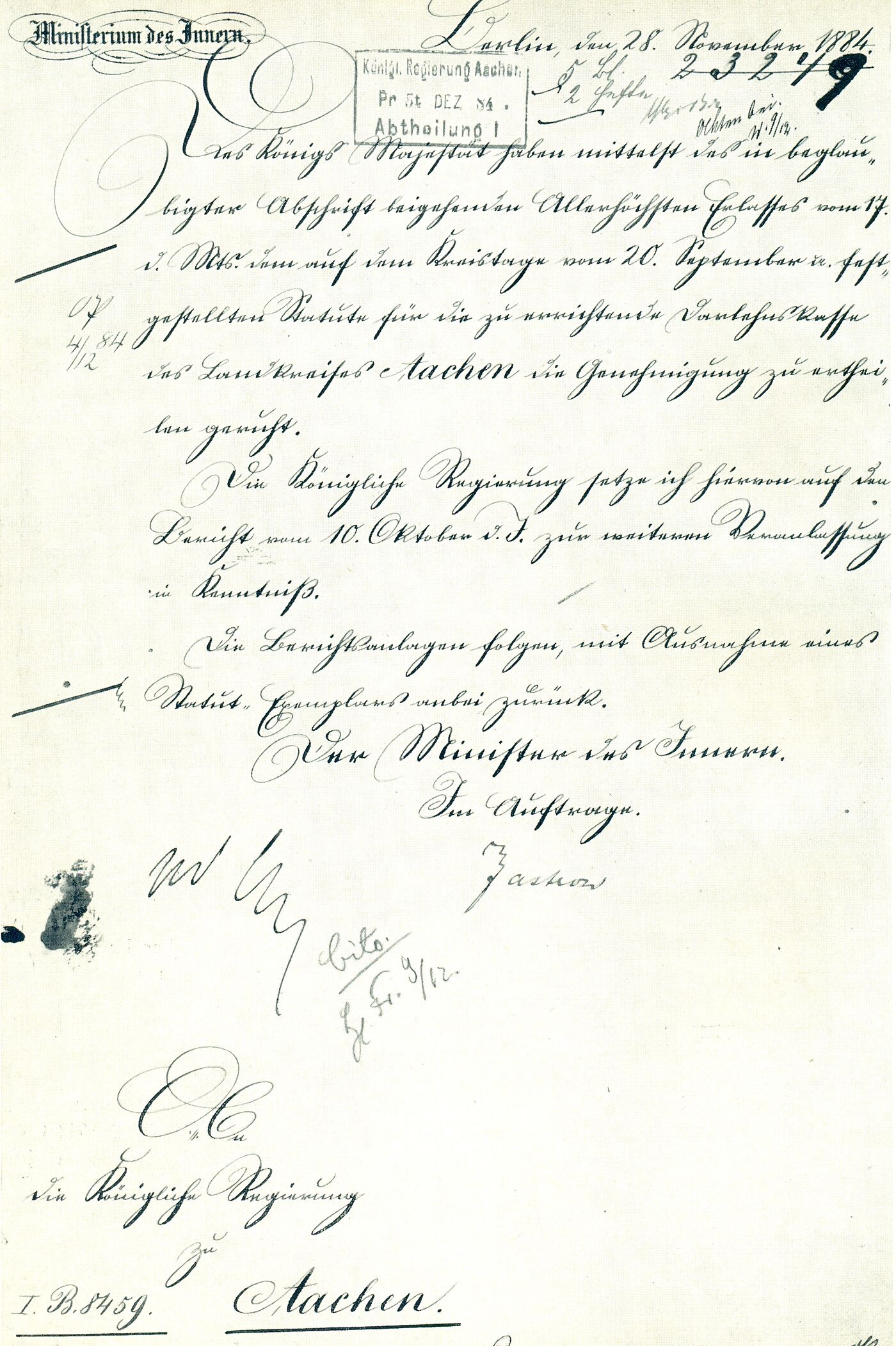 Bereits 1884 griff Landrat von Coels mit Überzeugung die Überlegungen zur Gründung einer Darlehnskasse für die Bewohner des Landkreises auf, die vor über 20 Jahren von seinem Vorgänger Hasenclever negativ beurteilt worden waren. Wie in anderen Landkreisen Preußens wurde die Kreis-Darlehenskasse gegründet um „den kleinen Ackerwirthen, Handwerkern, überhaupt allen Kreisen von Handarbeitern Gelegenheit zu geben […] kleine Darlehen gegen gewöhnliche Zinsen zu erhalten“. Zwei Monate nach Eröffnung der Kasse, die ihren Sitz in der Stadt Aachen hatte, am 3. Juni 1885, wurde das erste Darlehen an einen Bürger aus Höngen verbucht. 1895 wurde die bisherige Darlehnskasse des Landkreises Aachen in eine Spar- und Darlehnskasse umgewandelt und erhielt ihre Kassenstelle im neu errichteten Landratsamt in der Zollernstraße.
